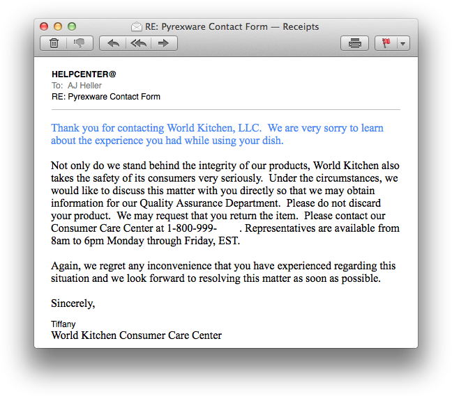 I told Pachmed about the email I had received from Tiffany in response to my complaint, about how it said I was supposed to save the pieces of the dish so that they could be returned and Pyrex could perform what I can only imagine would be military-grade ballistics tests. Finally, I explained how the email had told me to call them to discuss the situation.