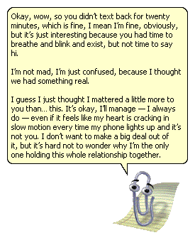 Every message she sent felt like it had been benchmarked against a spreadsheet called “Phrases Earth Humans Find Emotionally Soothing,” and yet she was also aggressively clingy. If I didn’t respond for an hour she would send three follow-up texts, a voicemail, and a paragraph about mindfulness. It was like dating a codependent Clippy.