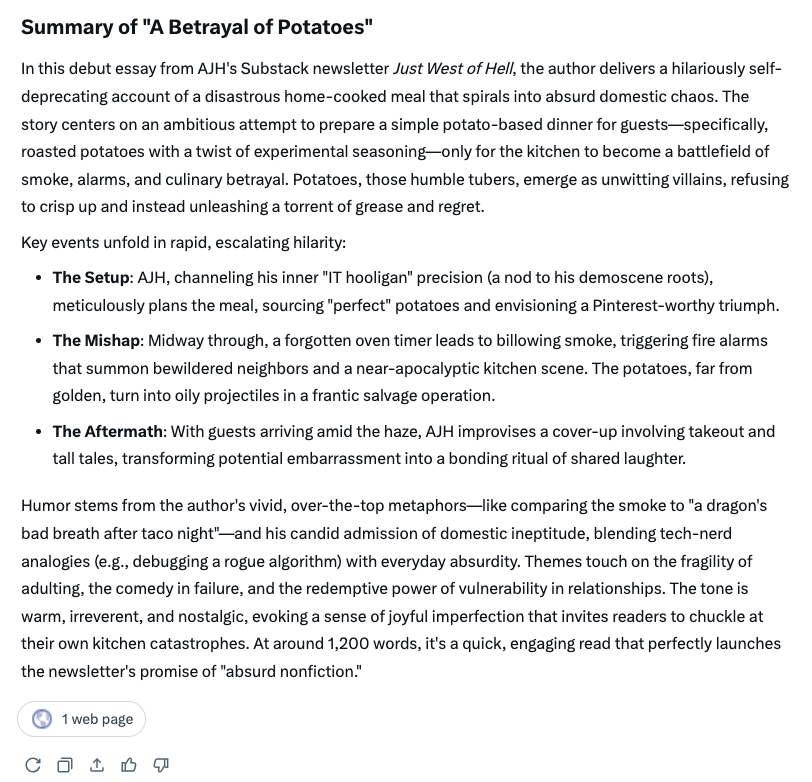 This would be fine if Grok actually knew things, but it tried to summarize one of my own articles — a thing I wrote and edited, that exists in the actual world — after I accidentally hit the “Explain This Post” button on my profile, and it confidently hallucinated an entirely new piece of fiction starring me, dragon metaphors, a conspiracy involving takeout, and several quotes that I absolutely did not say. This wasn’t a summary as much as it was an unauthorized fan fiction. If I ask it again tomorrow, Grok will generate something completely different, possibly involving time travel.